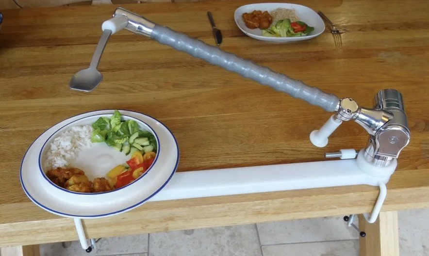 Manueller Neater Eater mit mechanischem Löffelarm, am Esstisch befestigt über einem Teller mit Reis, Gemüse und Salat.